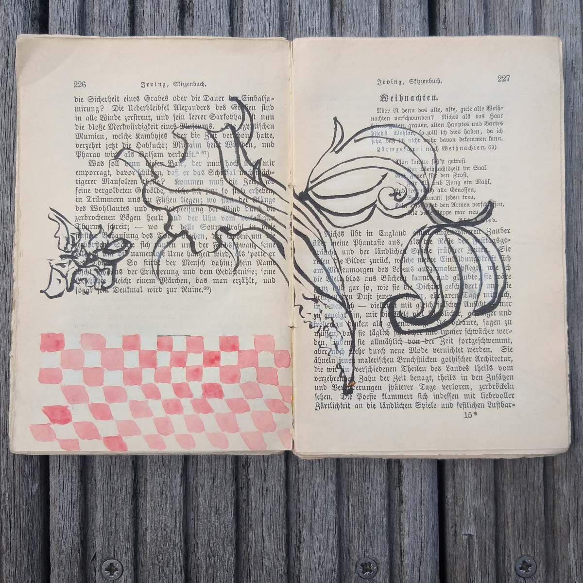 Das wunderbare alte Papier, die schöne Schrift, die leichten und zugleich sehr unterhaltsamen Worte und das kleine transportable Format luden direkt ein, eine weitere Ebene Skizzen über die Blätter zu bringen.